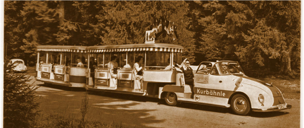 Katz. Das erste Bähnle hatte eine Zugmaschine und zwei Anhänger, es war ca 25 Meter lang und bot Platz für ca 40 Gäste.Der Fahrer der